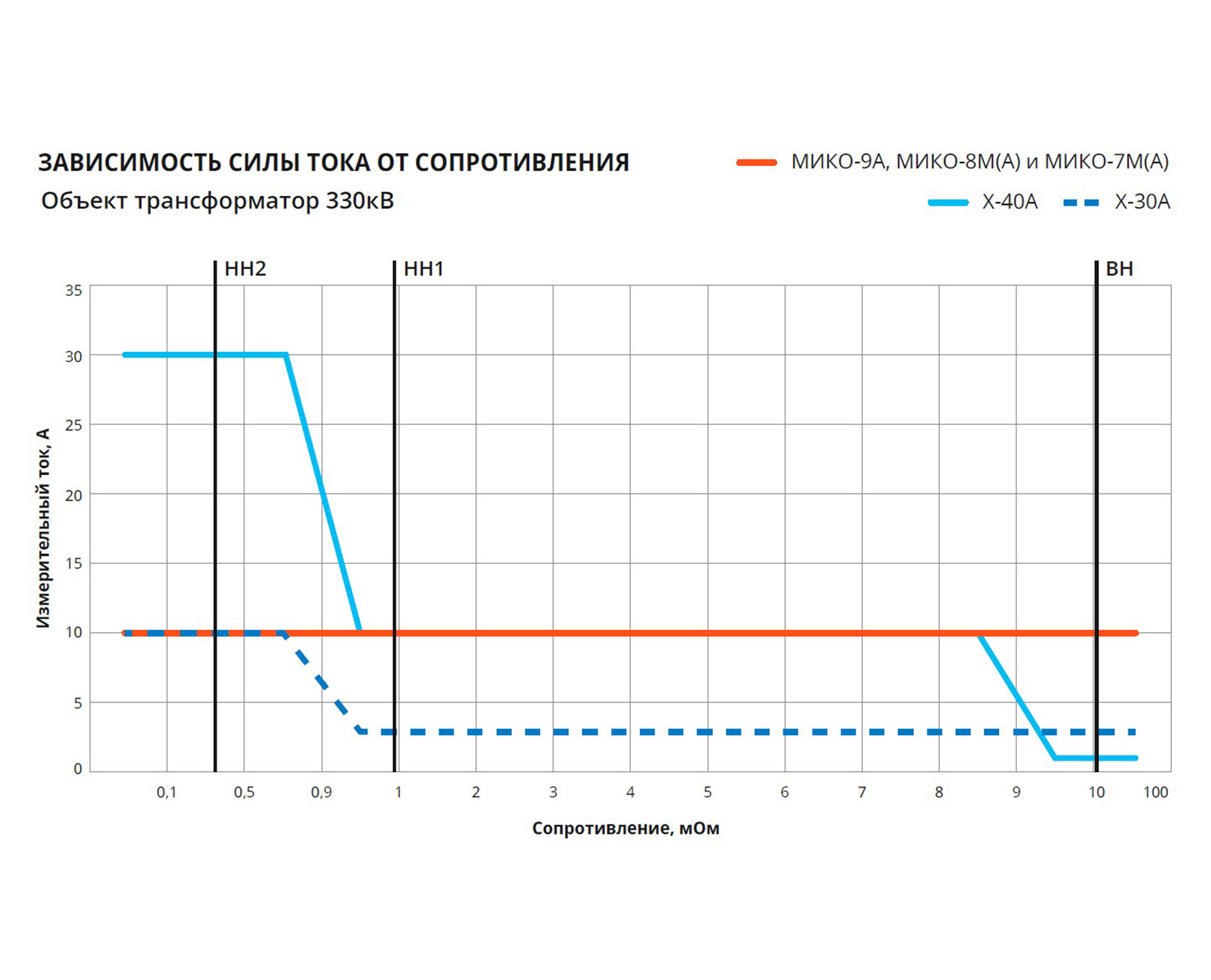 [0] => Сравнение зависимости силы тока от сопротивления: приборы МИКО и аналоги Х-30А/Х-40А