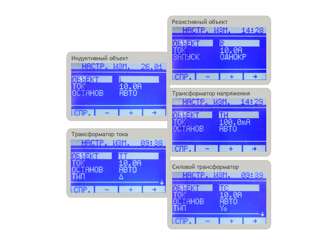 В МИКО-7М(А) реализованы специализированные режимы измерения для различных конфигураций 5 объектов (резистивный объект, индуктивный объект, трансформатор напряжения, трансформатор тока и силовой трансформатор), учитывающие их специфические особенности. Наличие данной функции позволяет систематизировать результаты измерений, а также обеспечить комфортную работу с архивом.