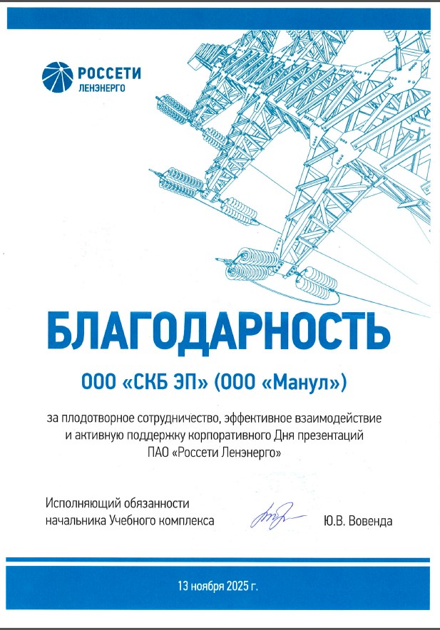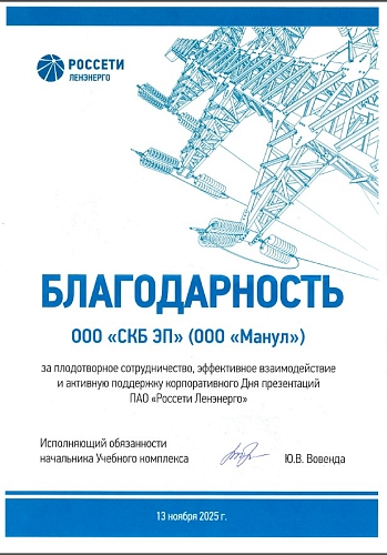Благодарственное письмо от ПАО "Россети" за участие в выставке-форуме в рамках соревнований профмастерства, в качестве эксперта, консультанта и производителя приборов МИКО-1, МИКО-21 и ПКВ/М7, с которыми работали участники соревнований, 2016