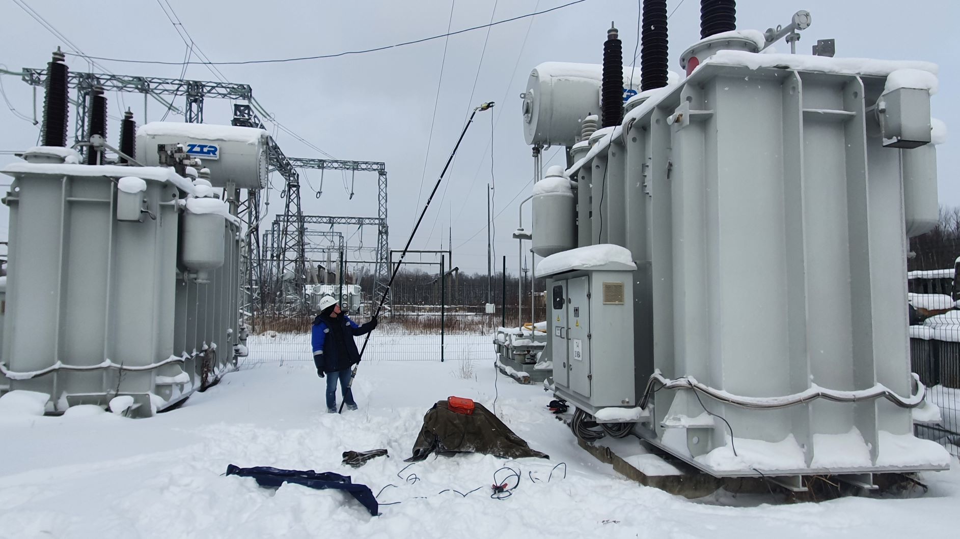 Для того, чтобы работать на силовом трансформаторе, например, типа ТДТН-25000/110 необходимо «взбираться» на него или вызывать подъемник, который очень дорогостоящий для осуществления обычных текущих испытаний. Поэтому для экономии Вашего бюджета компания СКБ ЭП реализовала специальное устройство – штангу-манипулятор, которая была задействована и на наших испытаниях для прикрепления измерительных кабелей прибора к вводам трансформатора с земли.