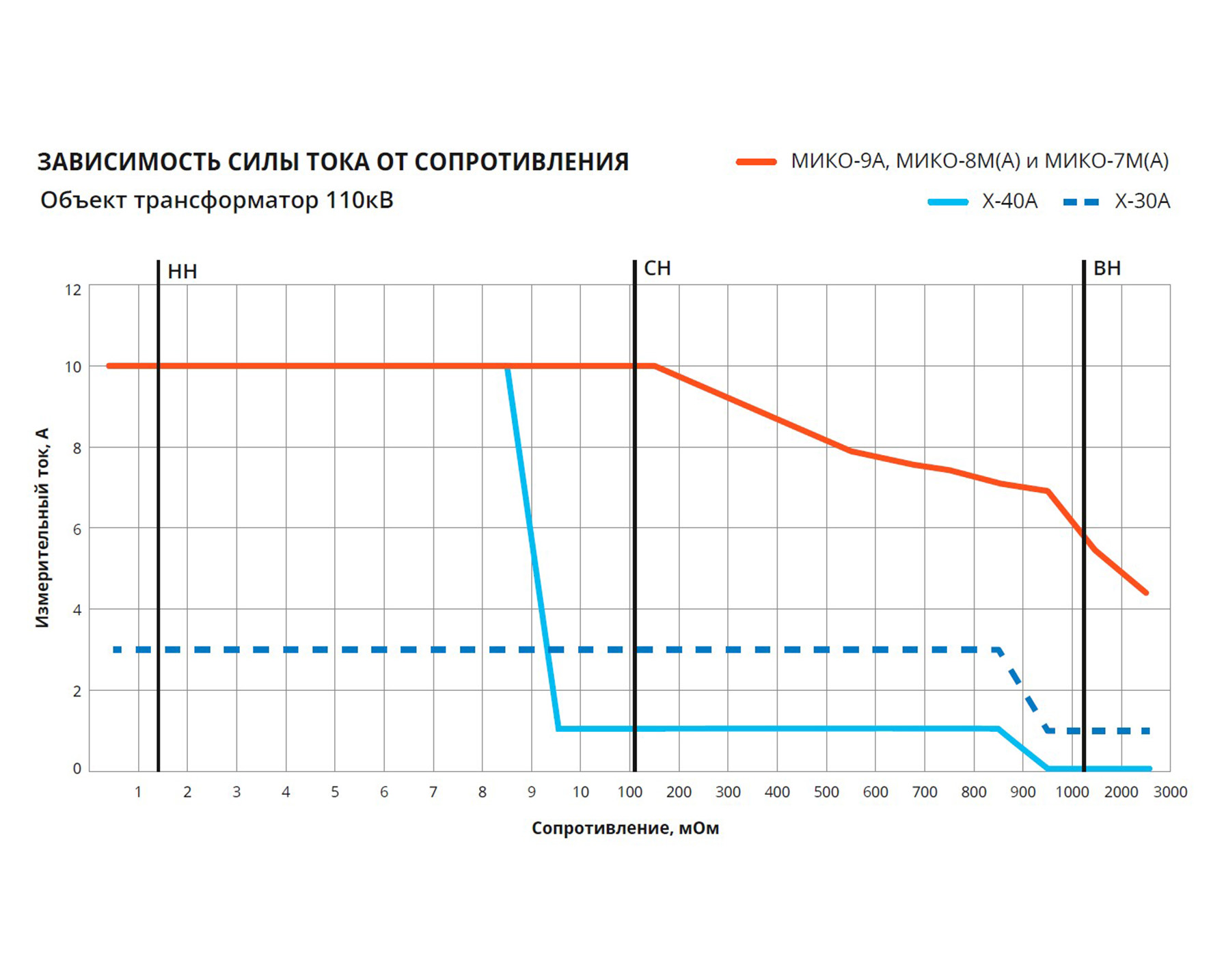При работах по измерению сопротивления постоянному току силовых и измерительных трансформаторов отлично зарекомендовал себя прибор МИКО-9А (эксплуатируется с 2019 г.). Из основных преимуществ прибора можно выделить следующие: