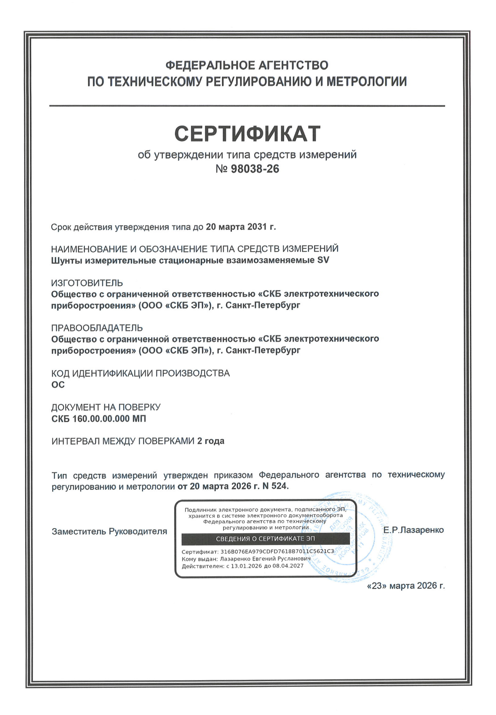 | Шунты SV | 98038-26 | до 20.03.2031 | 2 года | 2 года |
